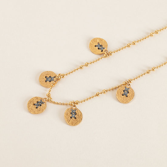 Mounted on a ball chain, the particularity of the MANOYA necklace lies in its 5 medals hammered and embroidered by hand...