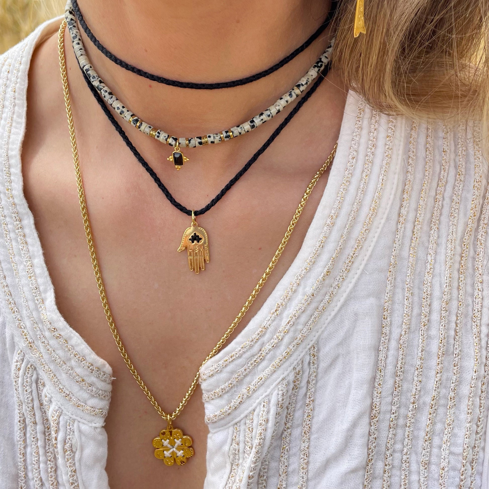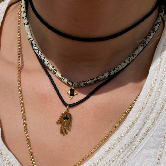 Le collier MAVROS, avec ses perles mouchetées de beige et de noir et sa pierre noire centrale, évoque la beauté intemporelle des paysages grecs.