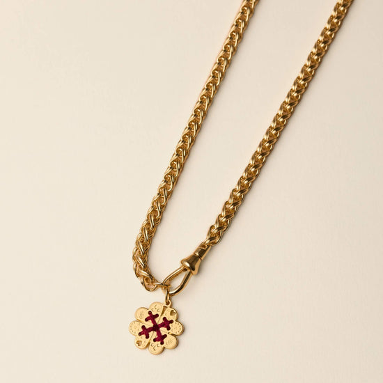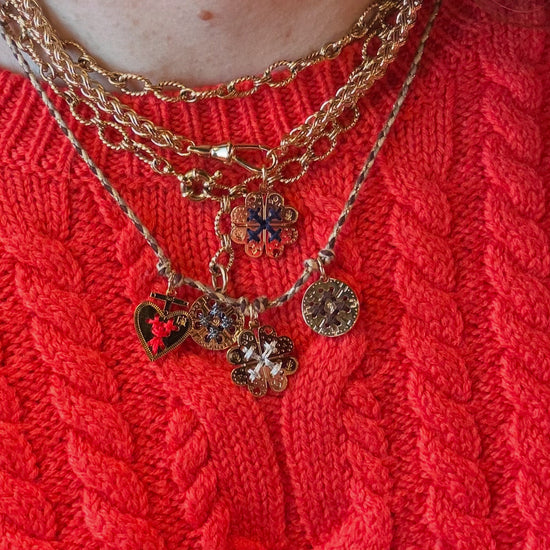 Le collier MIRA est une chaîne palmier avec un joli fermoir rétro accompagné de l'amulette OXALIS, notre trèfle à 4 feuilles porte-bonheur brodé de coton, et qui est amovible.