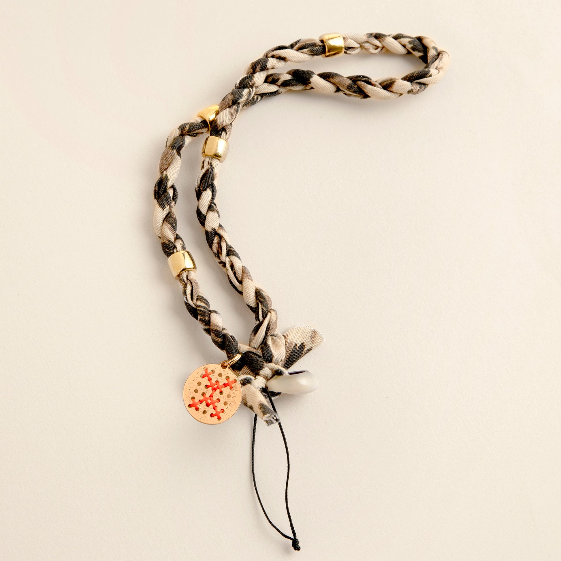 Formant une boucle de 40 cm (20 cm de longueur), il se compose d'un biais 100% Lyocell à motif léopard. Il est agrémenté de perles dorées et d'un coquillage cauri, lui apportant un style exotique et original ainsi que d’une amulette initiale, personnalisable et brodée en fil OEKO-TEX 100 ou en fil ciré fluo, en laiton recouvert d'or équitable 24k, offrant une touche personnelle et unique à votre bijou.