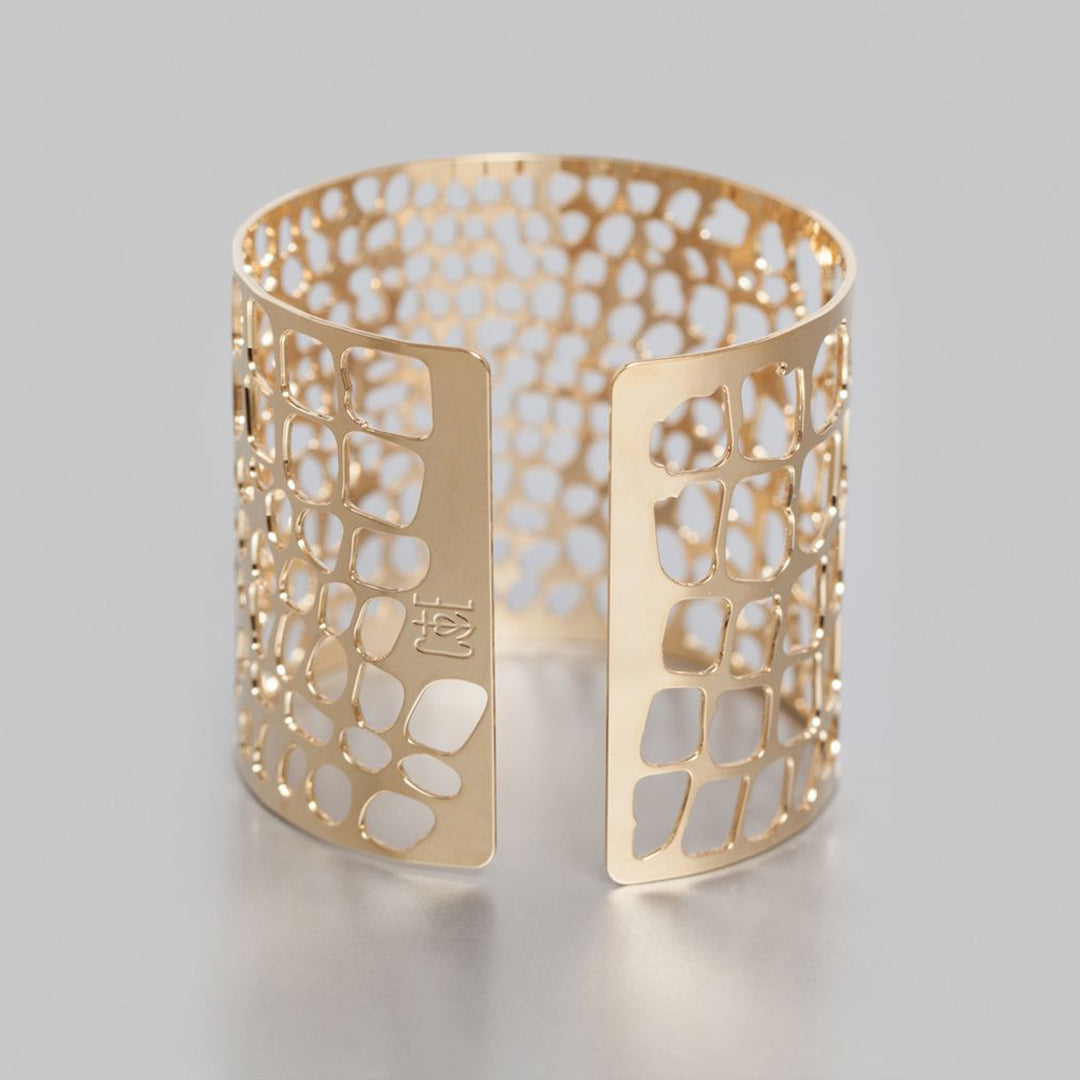 As light as air, the openwork COARI cuff was designed from the scaled skin of caimans in the Amazon...