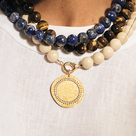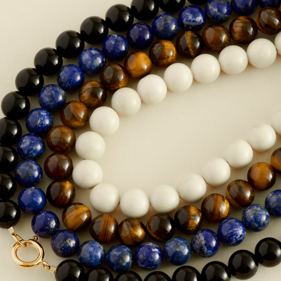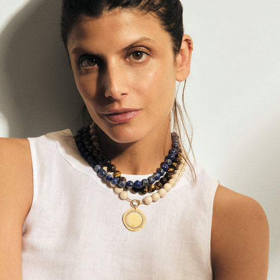 Le collier BALA est un rang de perles en pierre naturelle, imposant et élégant.