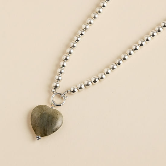 Le collier KARDIA est composé d’un rang de perles en hématite et d’une amulette cœur en labradorite grise qui est amovible.