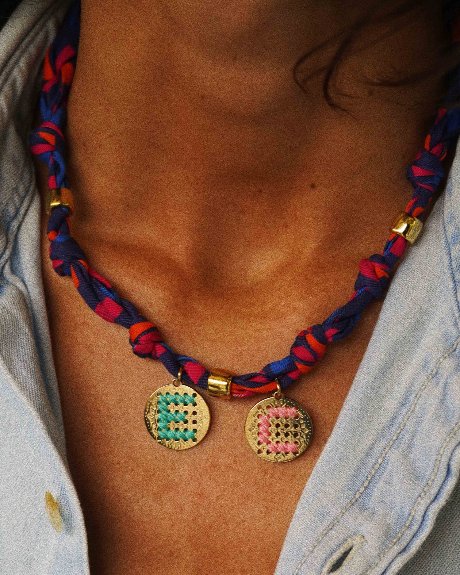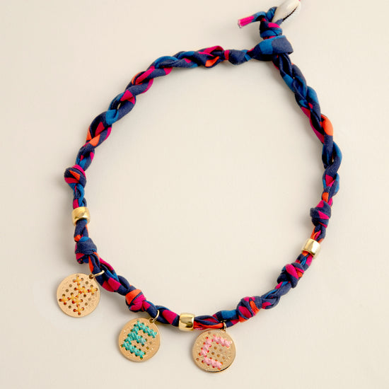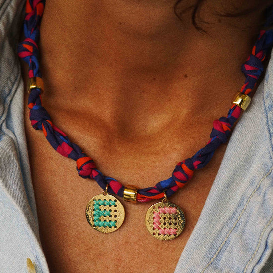 Mesurant 46 cm, il se compose d'un biais 100% Lyocell à motifs multicolores Keith dessiné par Elise Chalmin . Il est agrémenté de perles dorées et d'un coquillage cauri, lui apportant un style exotique et original et de une, deux ou trois amulettes initiales, personnalisables et brodées en fil de coton OEKO-TEX 100 ou en fil ciré fluo, en laiton recouvert d'or équitable 24k, offrant une touche personnelle et unique à votre bijou.