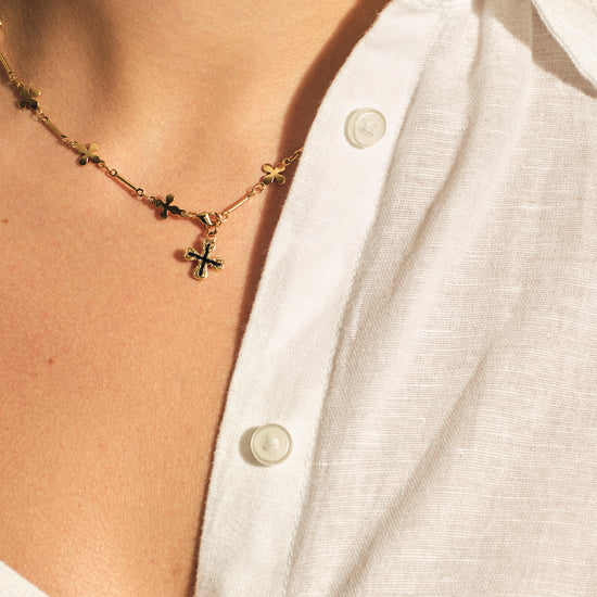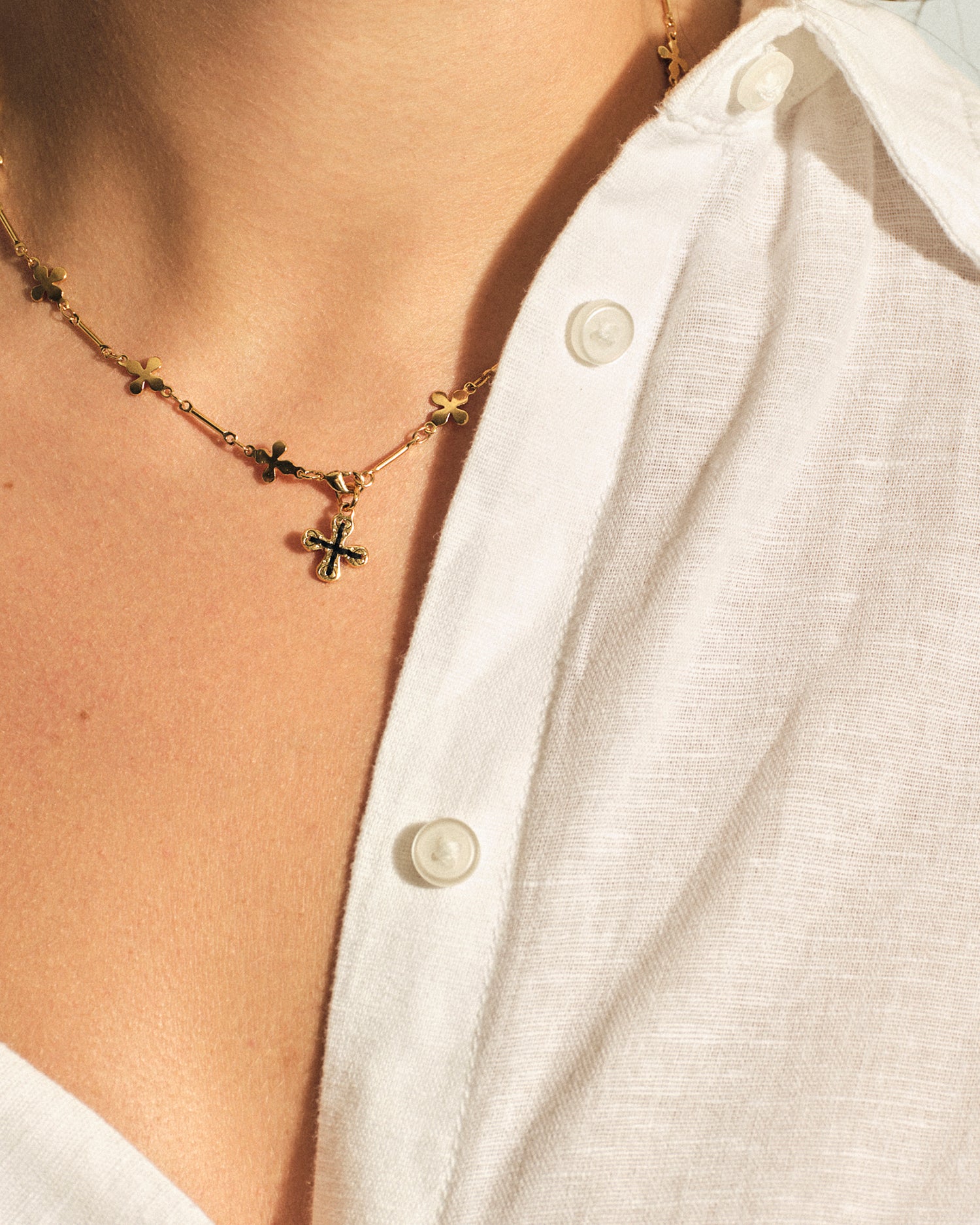 Le collier MILOS court est une chaîne très raffinée et légère, composée de dizaine de mini motif croix KEA.