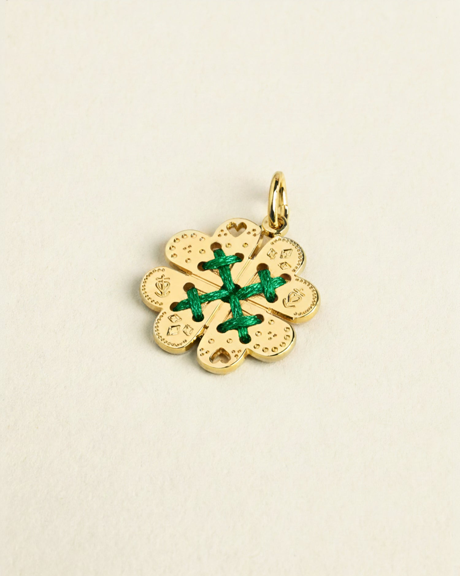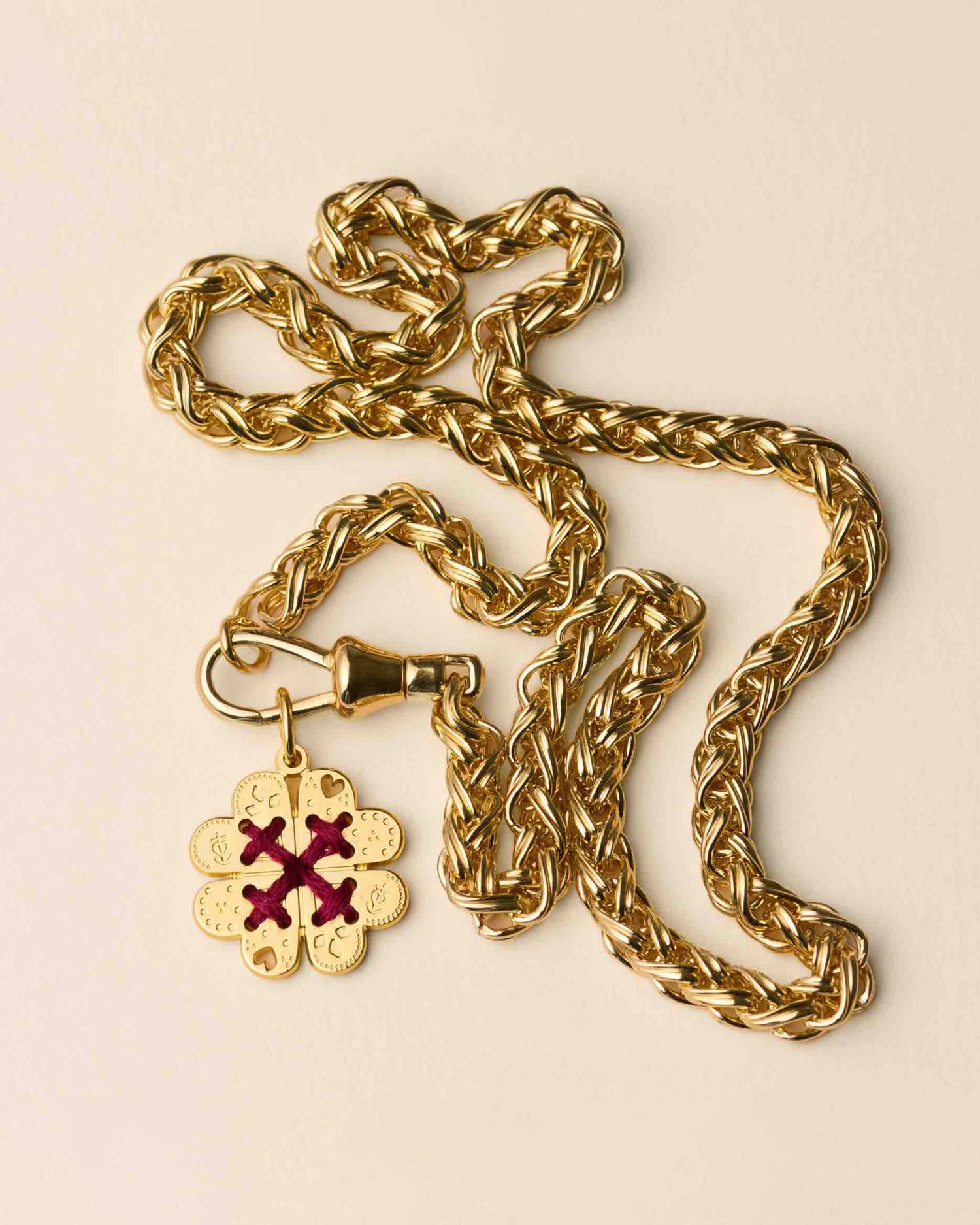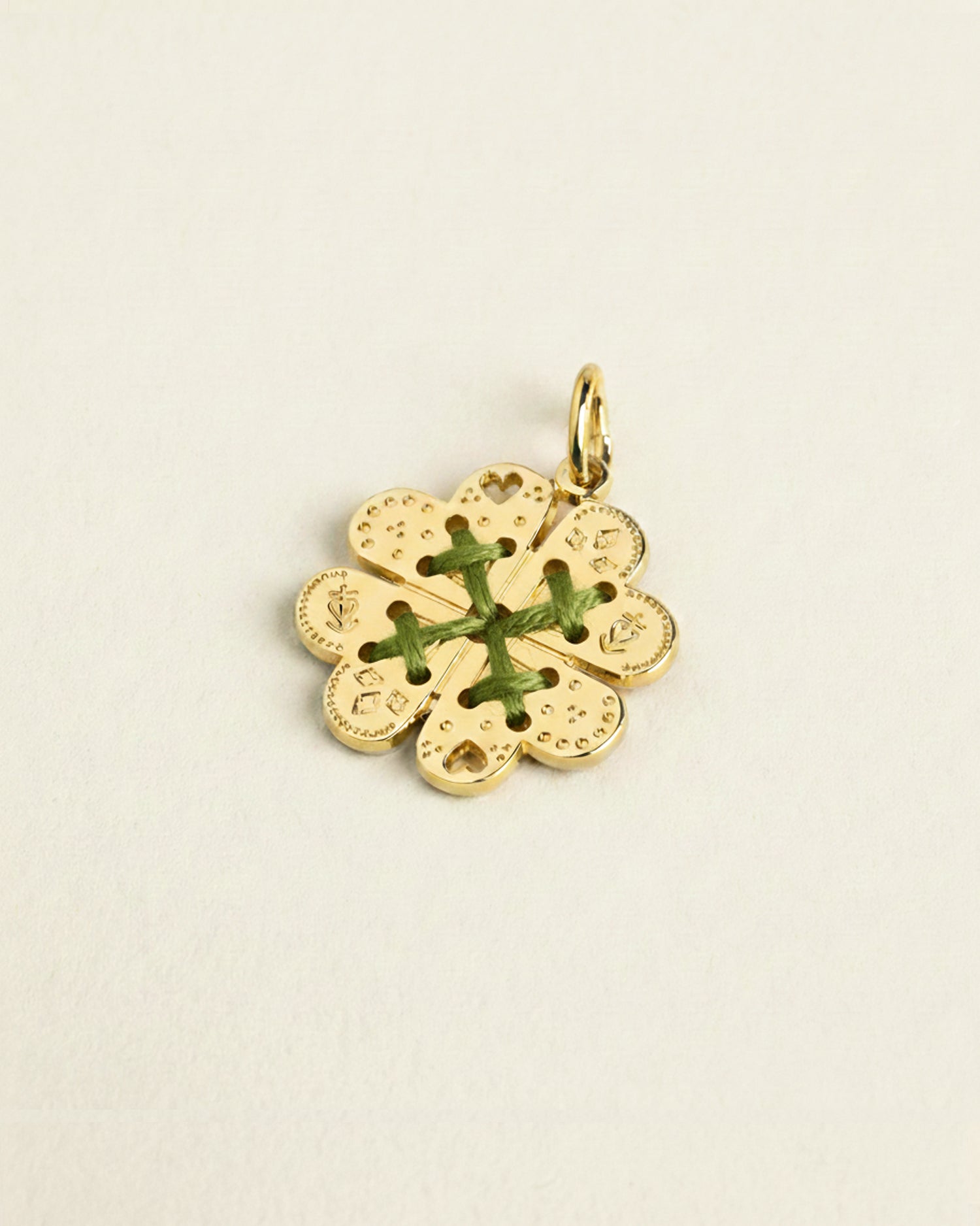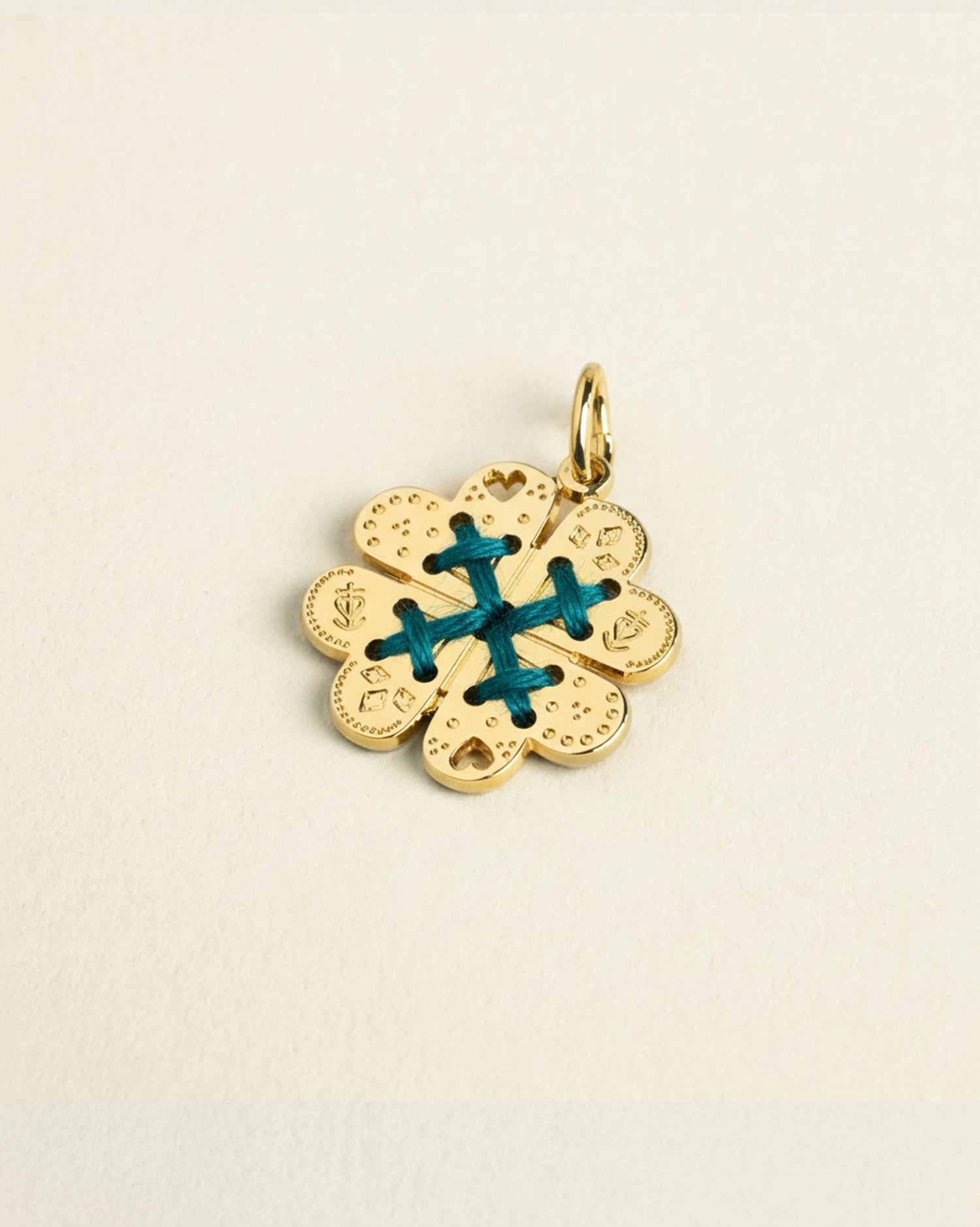 Le collier MIRA est une chaîne palmier avec un joli fermoir rétro accompagné de l'amulette OXALIS, notre trèfle à 4 feuilles porte-bonheur brodé de coton, et qui est amovible.