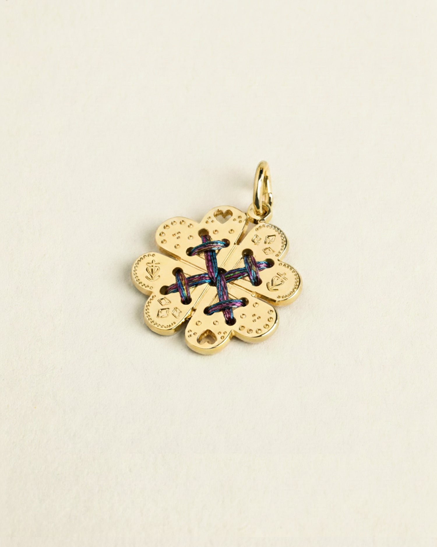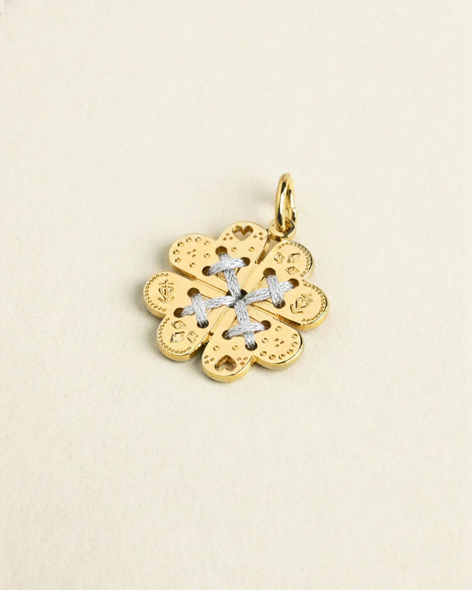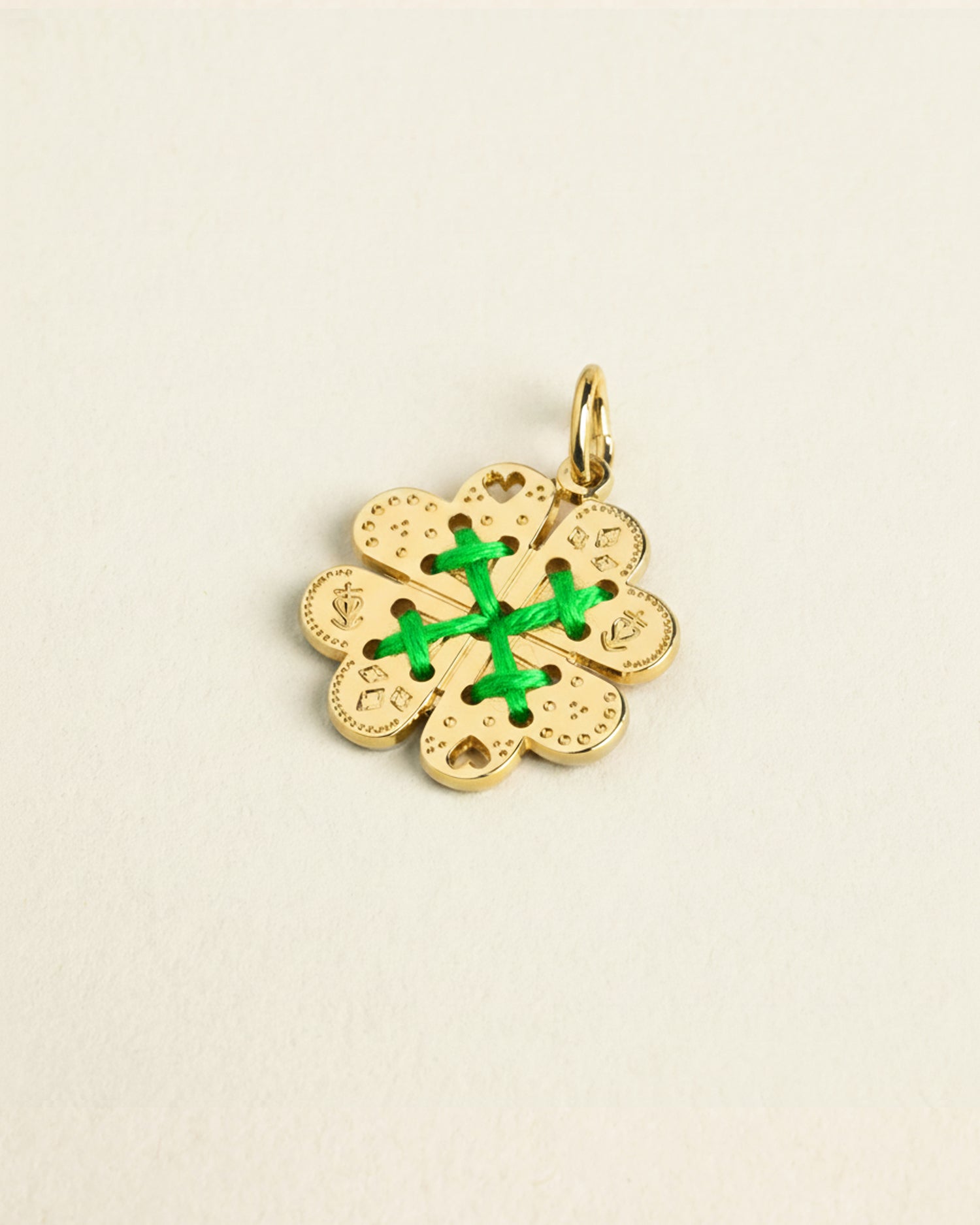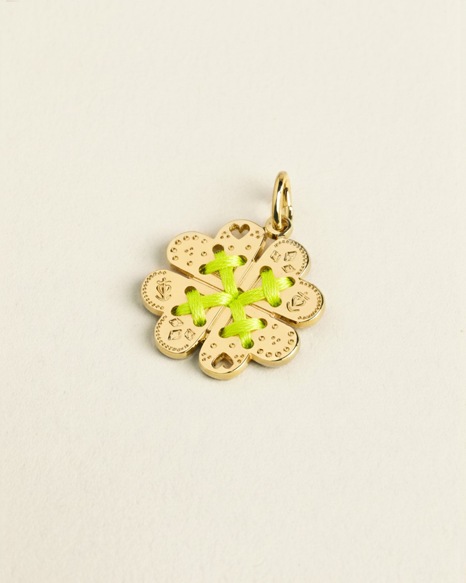 Le collier MIRA est une chaîne palmier avec un joli fermoir rétro accompagné de l'amulette OXALIS, notre trèfle à 4 feuilles porte-bonheur brodé de coton, et qui est amovible.