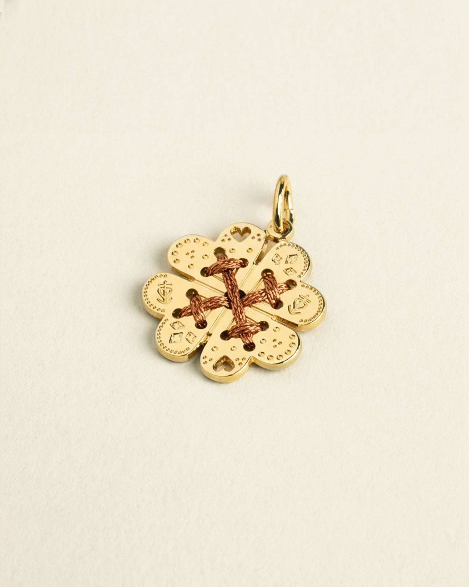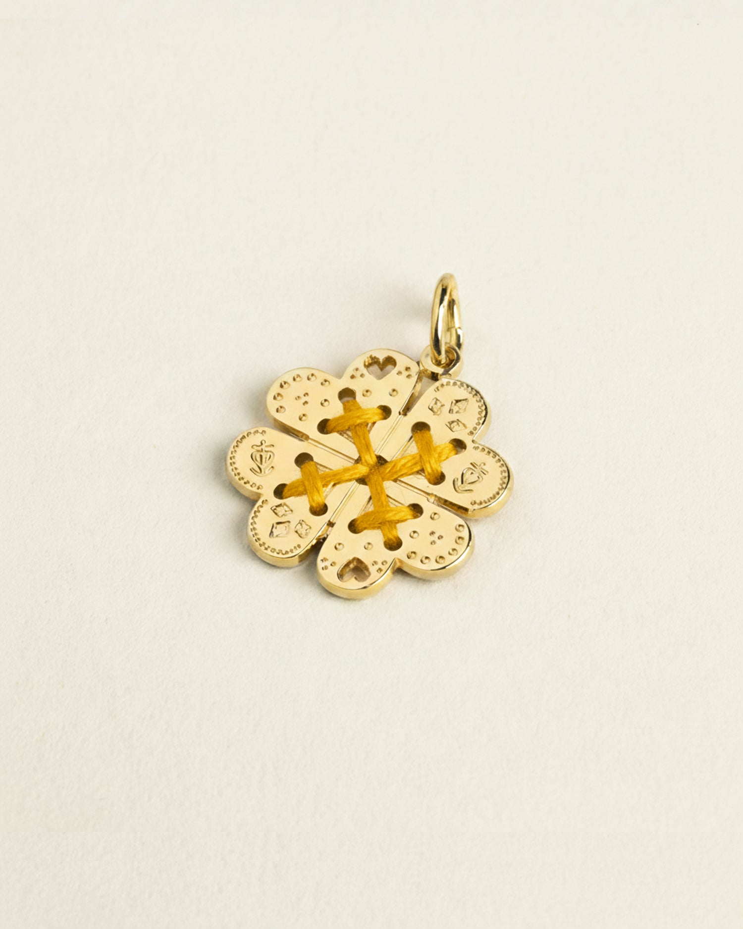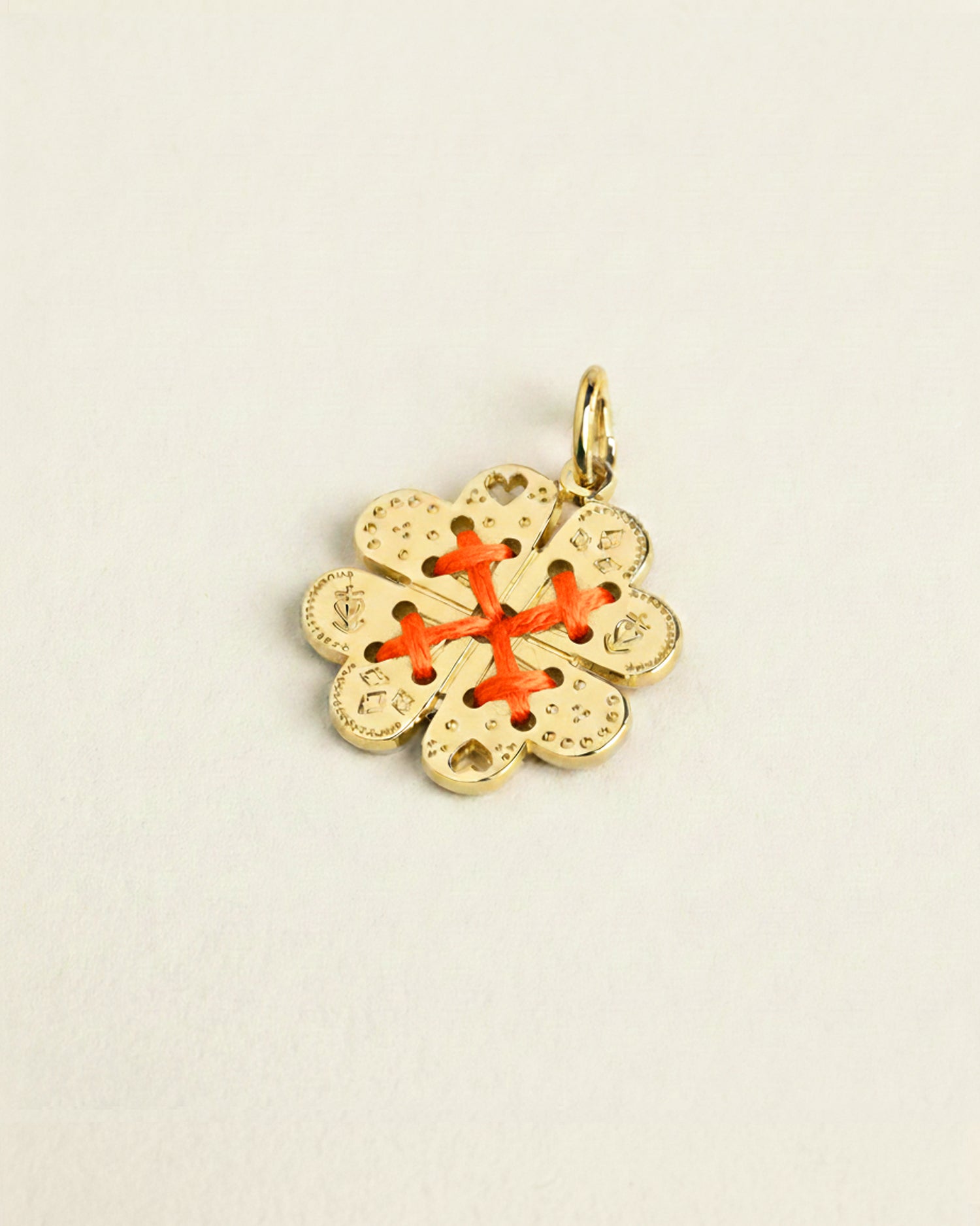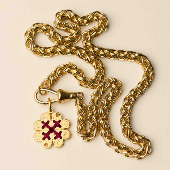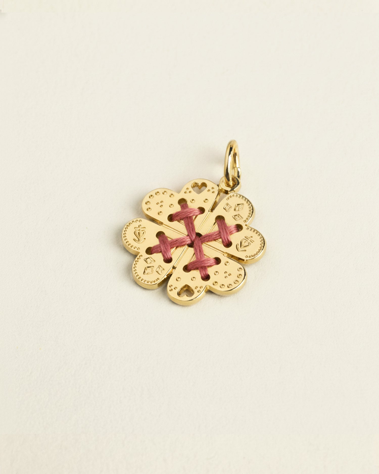 Le collier MIRA est une chaîne palmier avec un joli fermoir rétro accompagné de l'amulette OXALIS, notre trèfle à 4 feuilles porte-bonheur brodé de coton, et qui est amovible.