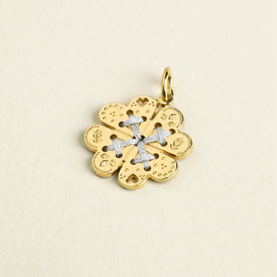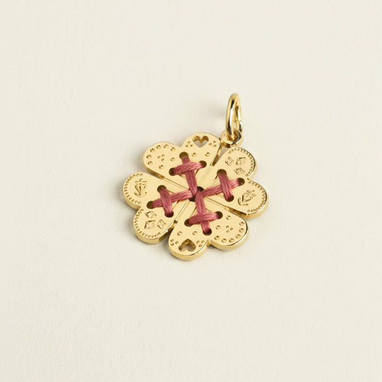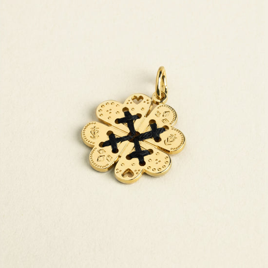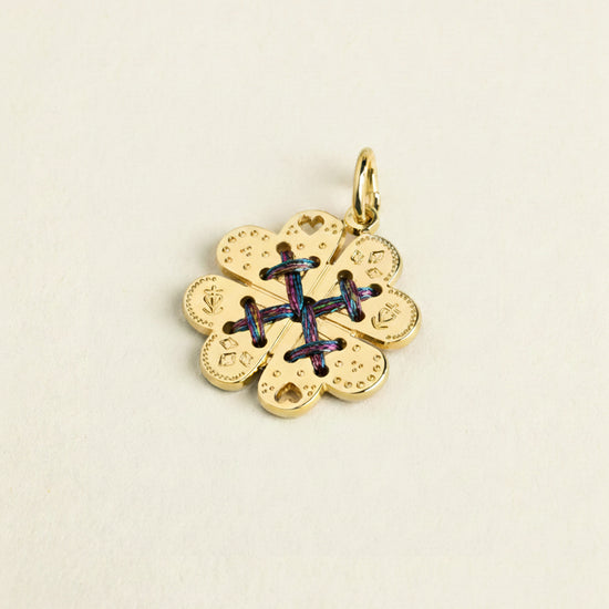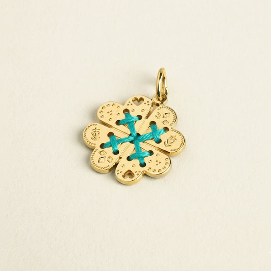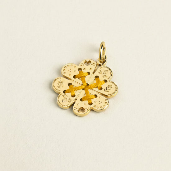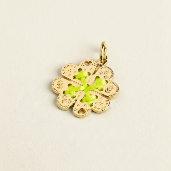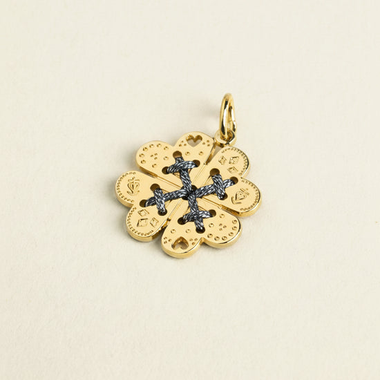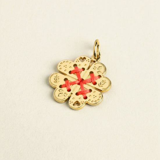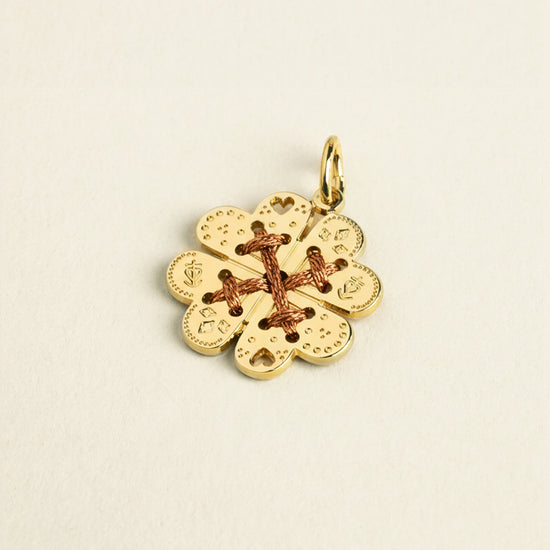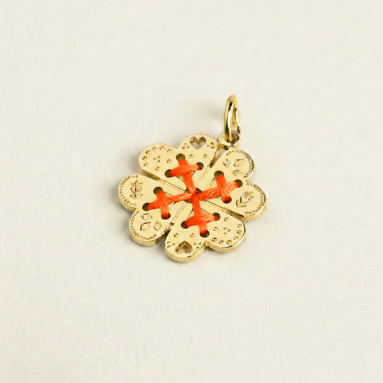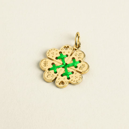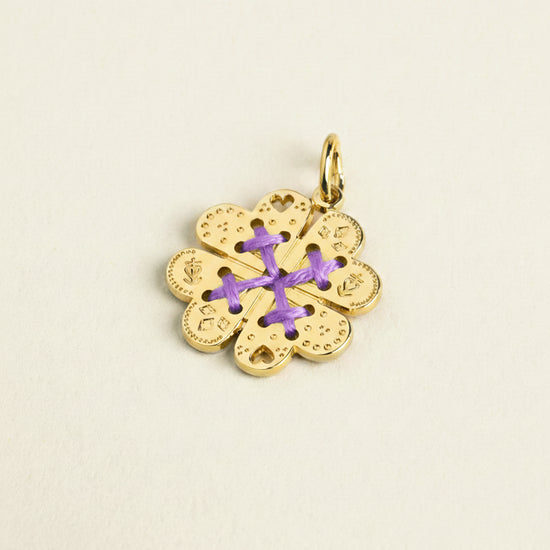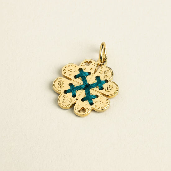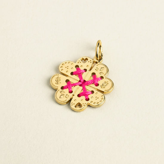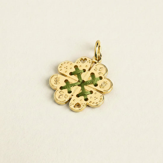Le collier MIRA est une chaîne palmier avec un joli fermoir rétro accompagné de l'amulette OXALIS, notre trèfle à 4 feuilles porte-bonheur brodé de coton, et qui est amovible.