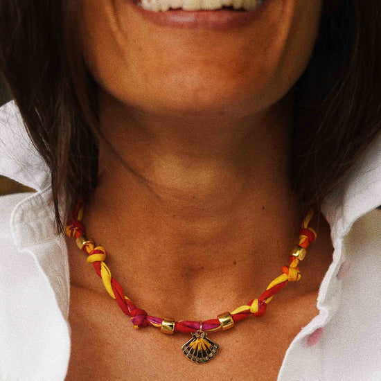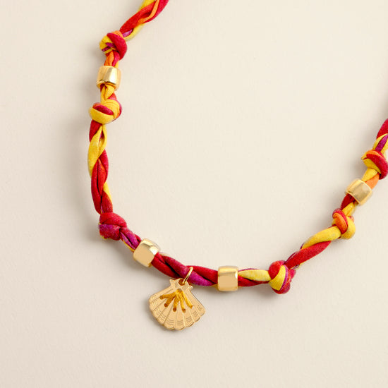 Mesurant 46 cm, il se compose d’un biais 100% Coton multicolore dessiné par Elise Chalmin. Des perles dorées et un coquillage cauri apportent une touche d'exotisme et d’originalité.