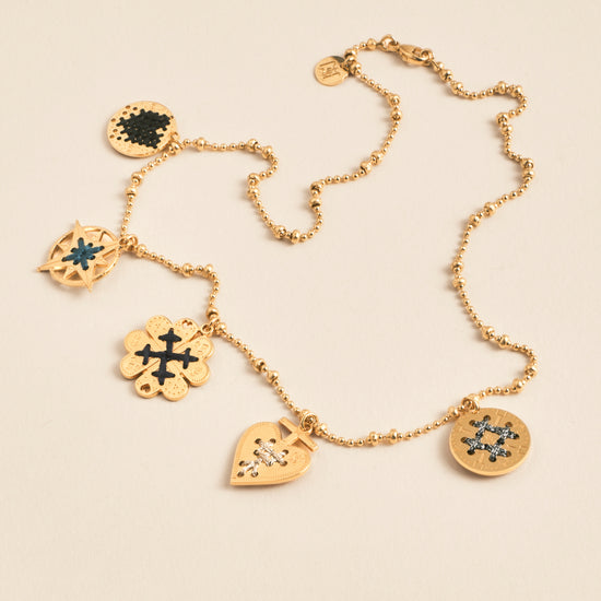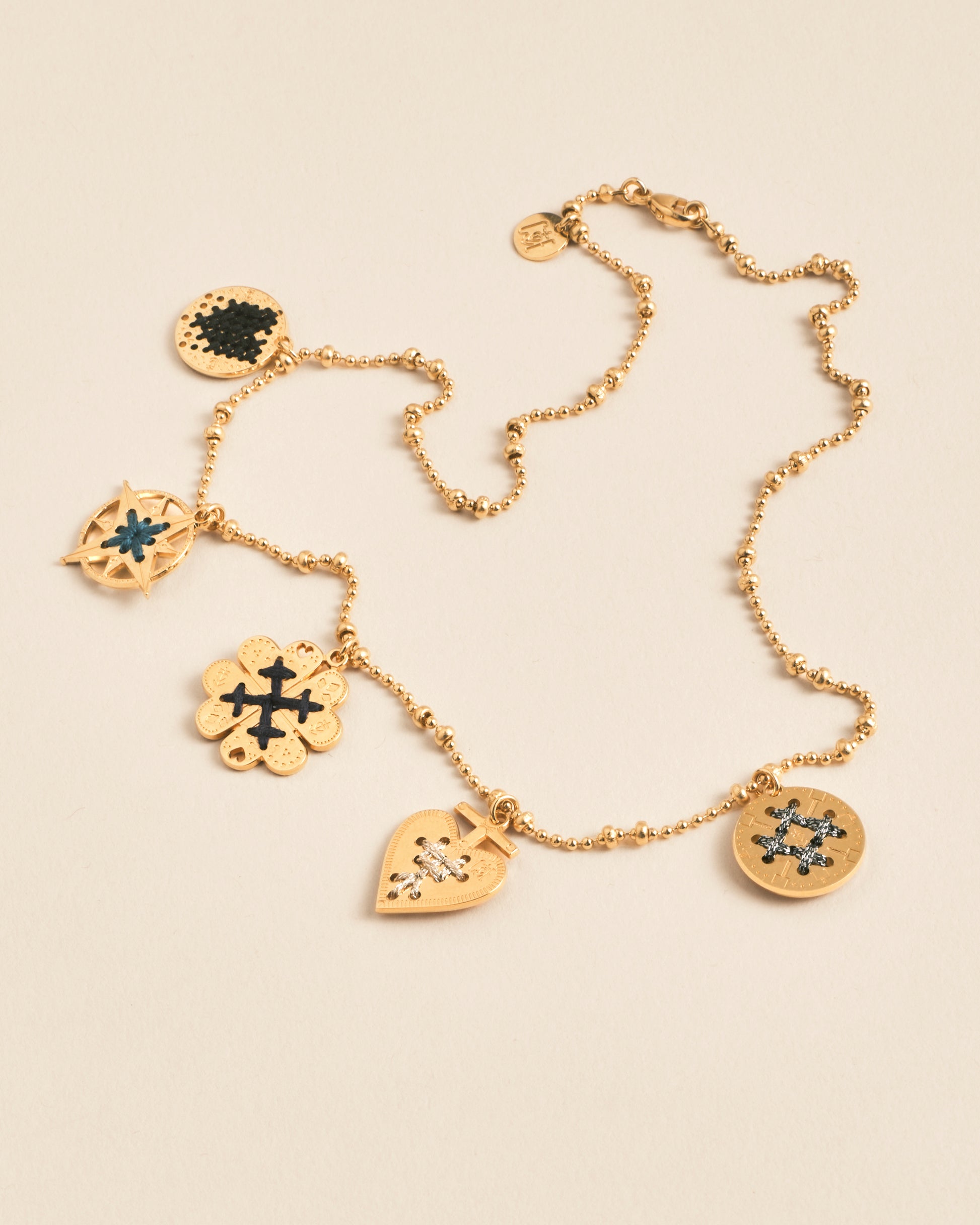 Coeur brodé, Abeille, Rose des vents, Trèfle à 4 feuilles, Coeur ex-voto,, Rond gravé de motif incas... un vrai voyage au mille couleurs.
