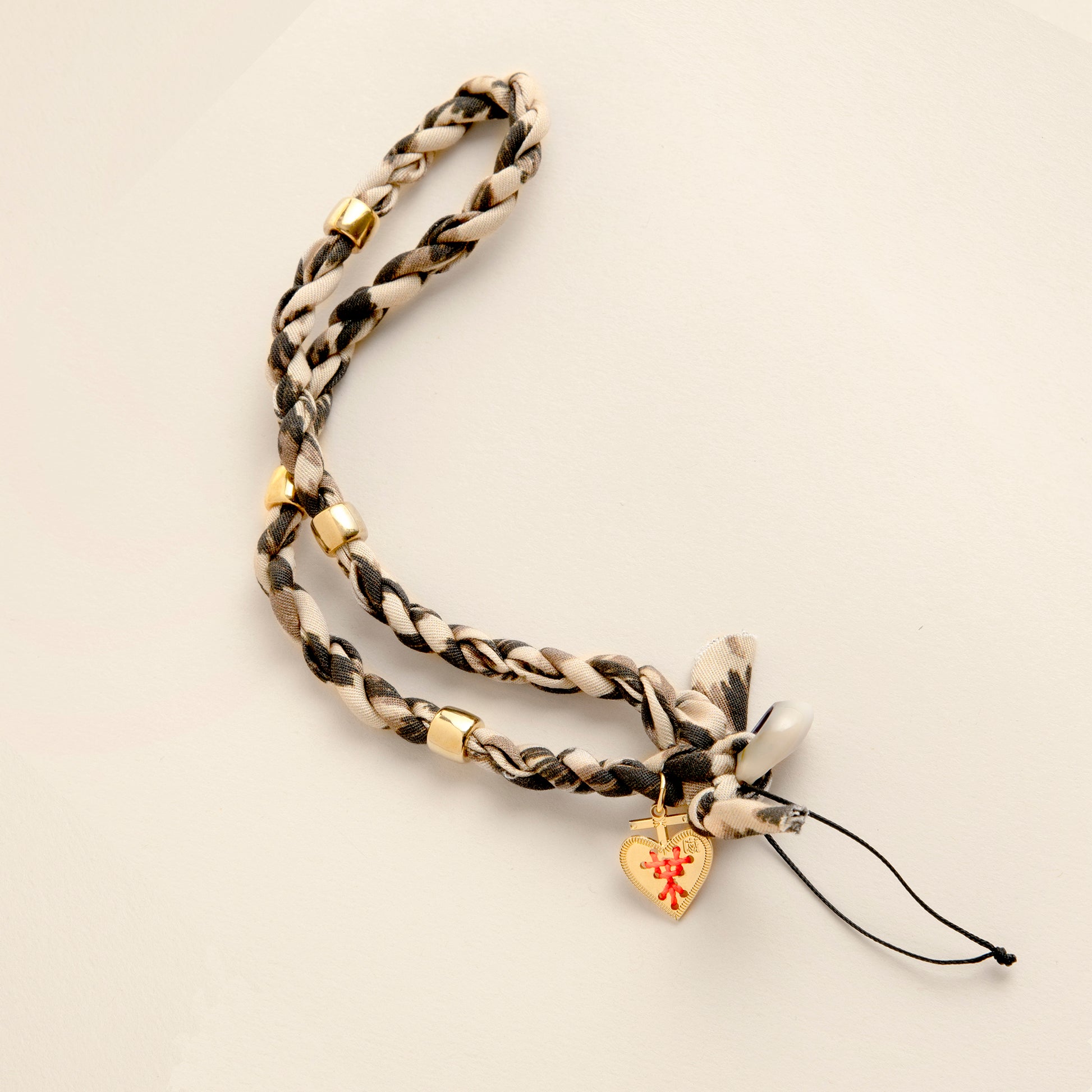 Formant une boucle de 40 cm, il se compose d'un biais 100% Lyocell à motif léopard Graou dessinés à la main par Elise Chalmin. Des perles dorées et un coquillage cauri apportent une touche d'exotisme et d’originalité.