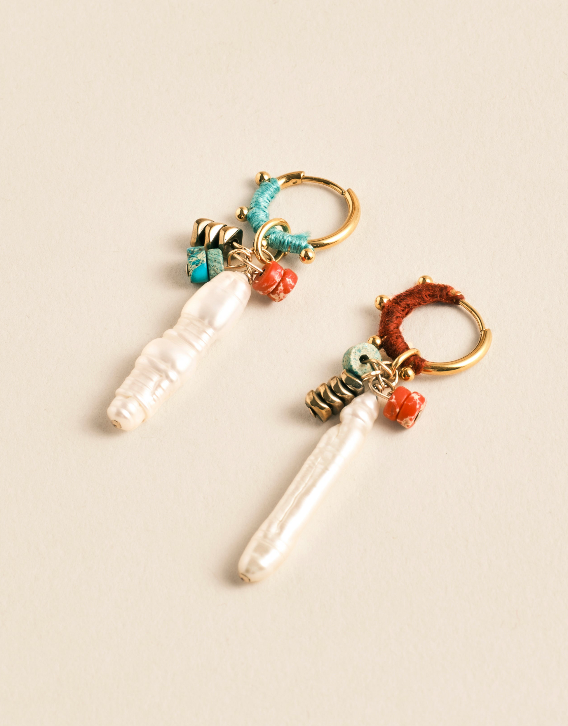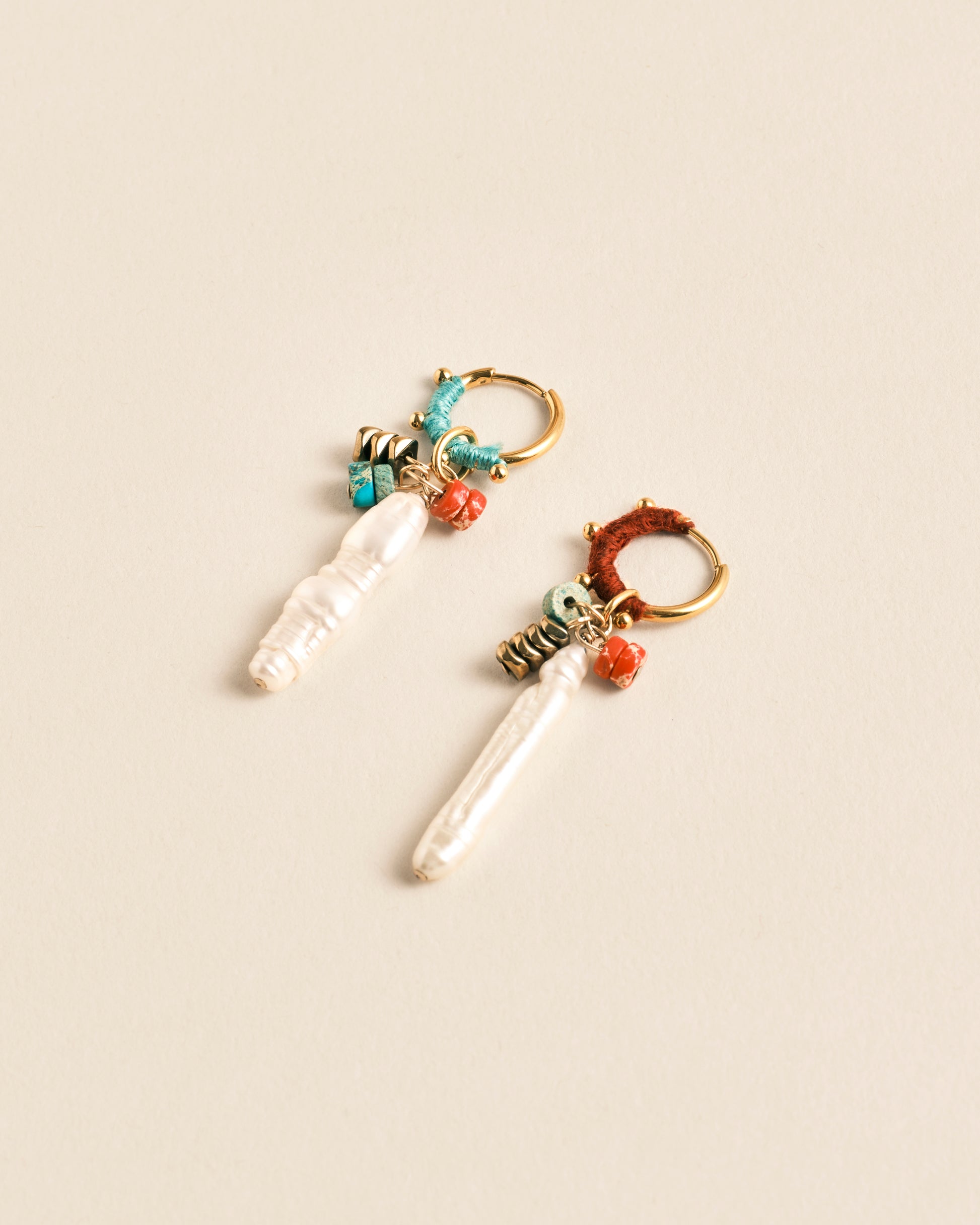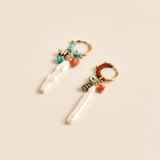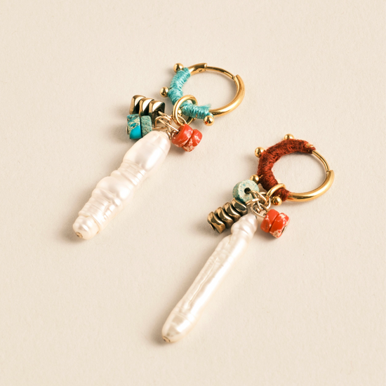 Notre créole ODESSA est habillée de coton et agrémentée d'une jolie perle d'eau douce allongée de forme baguette et de quelques perles naturelles.