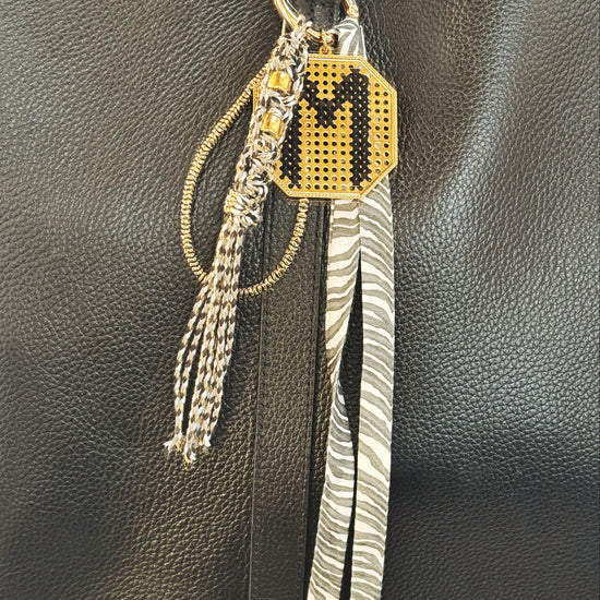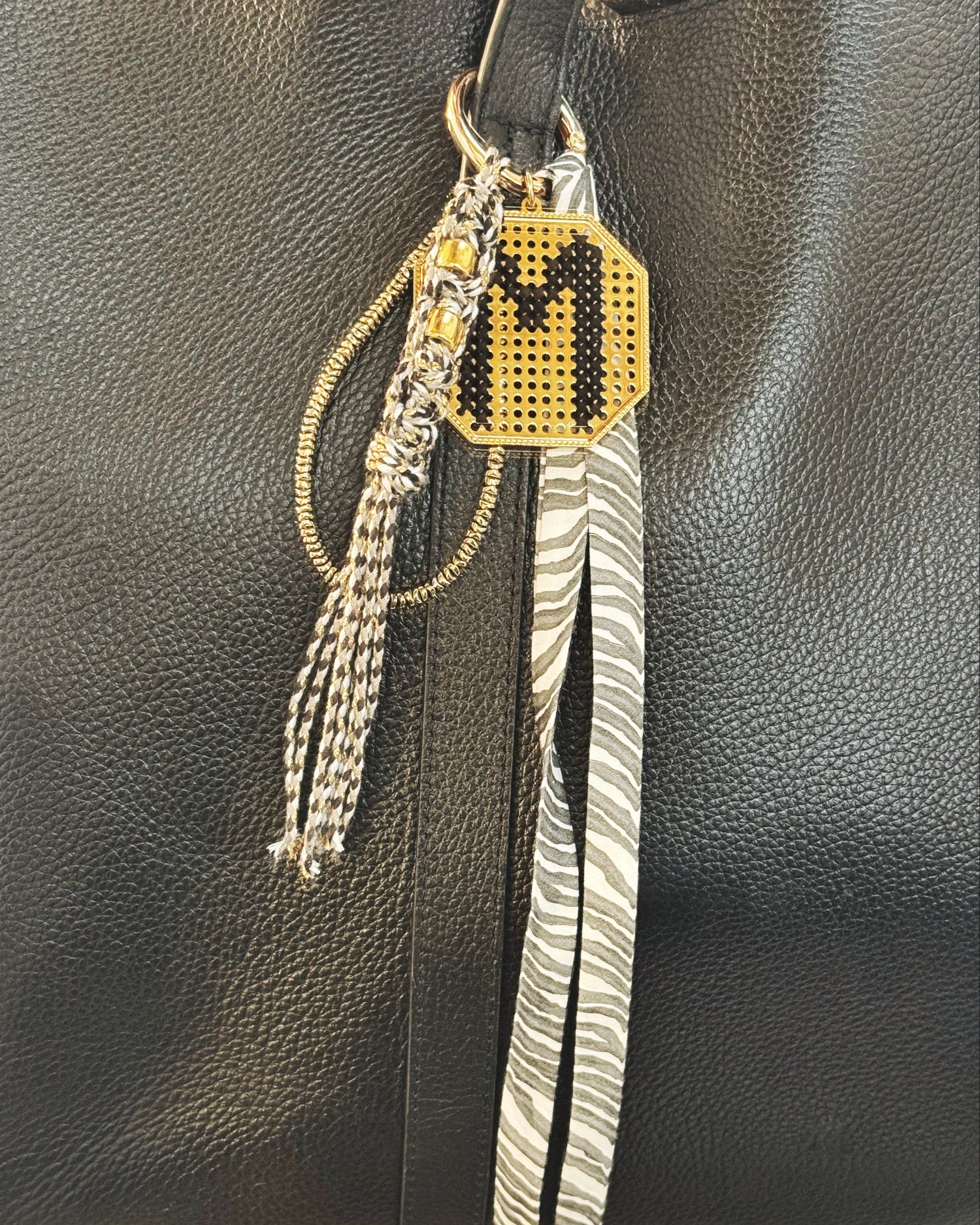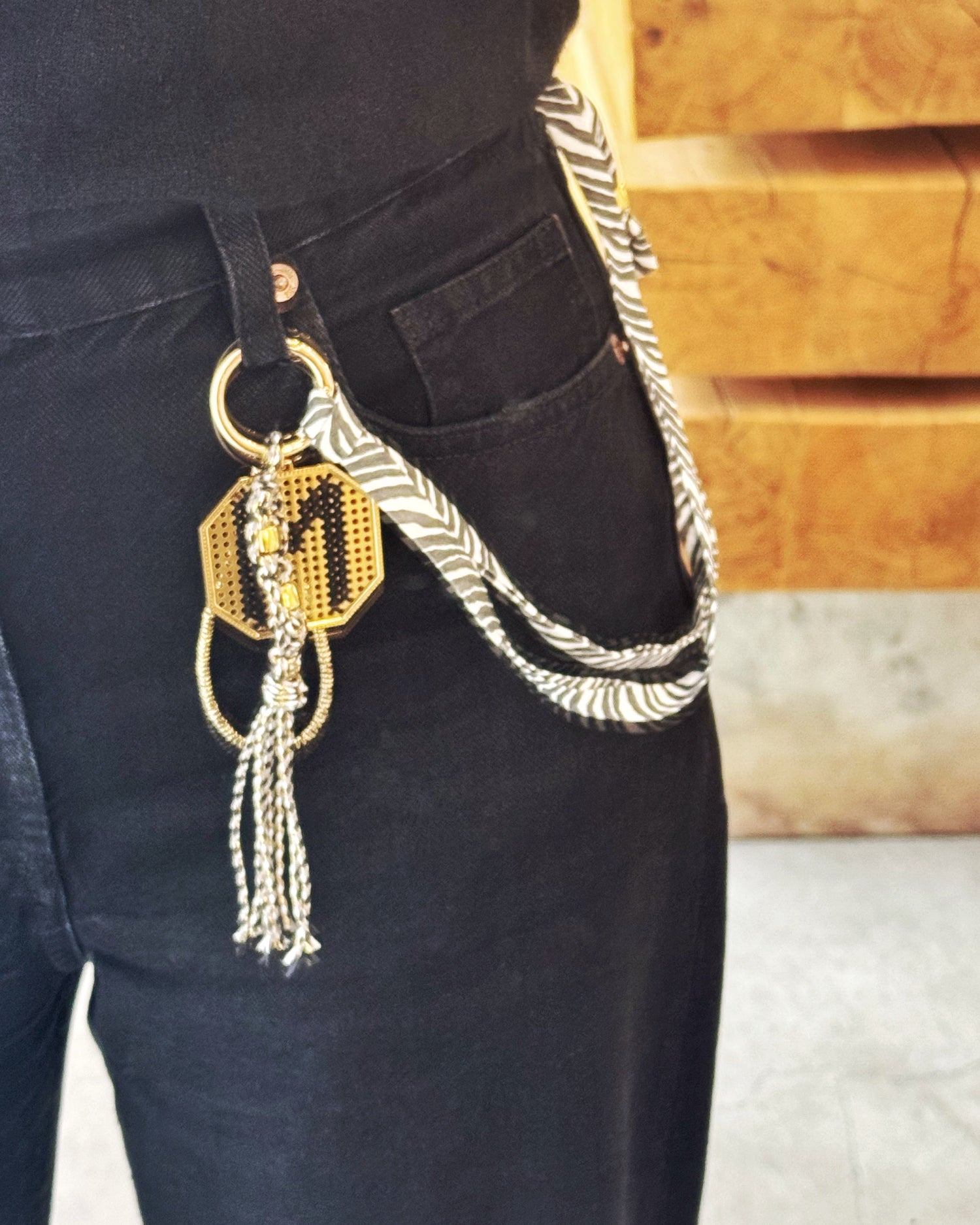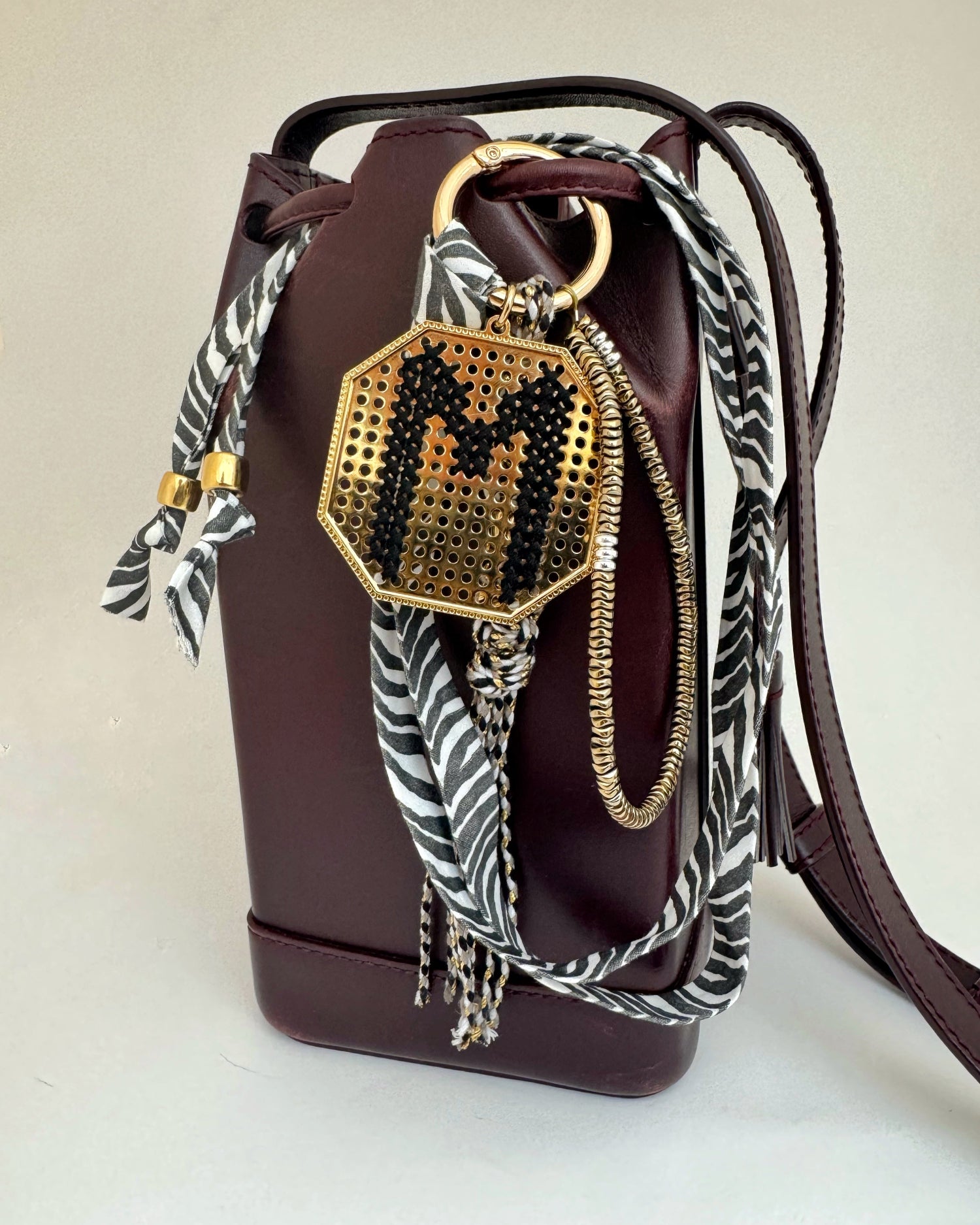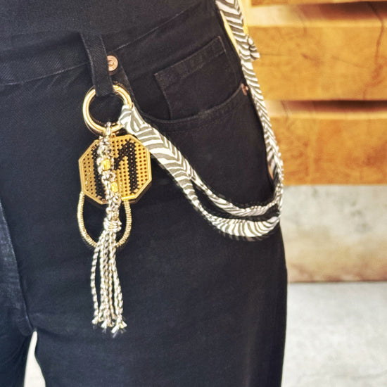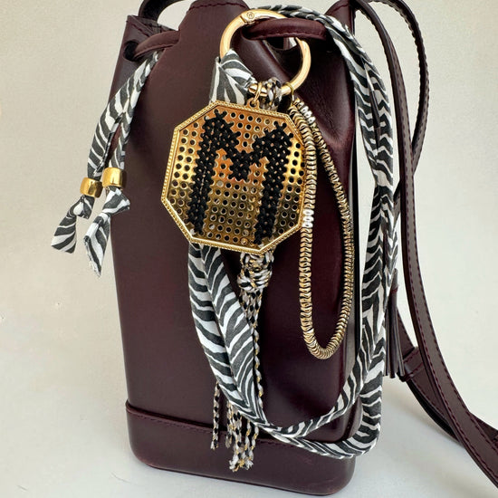 Le grigri ATI se porte sur votre sac à main, en porte-clés ou même en collier grâce au biais zébré à nouer.