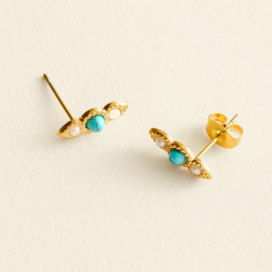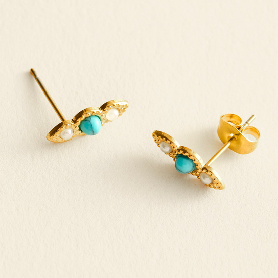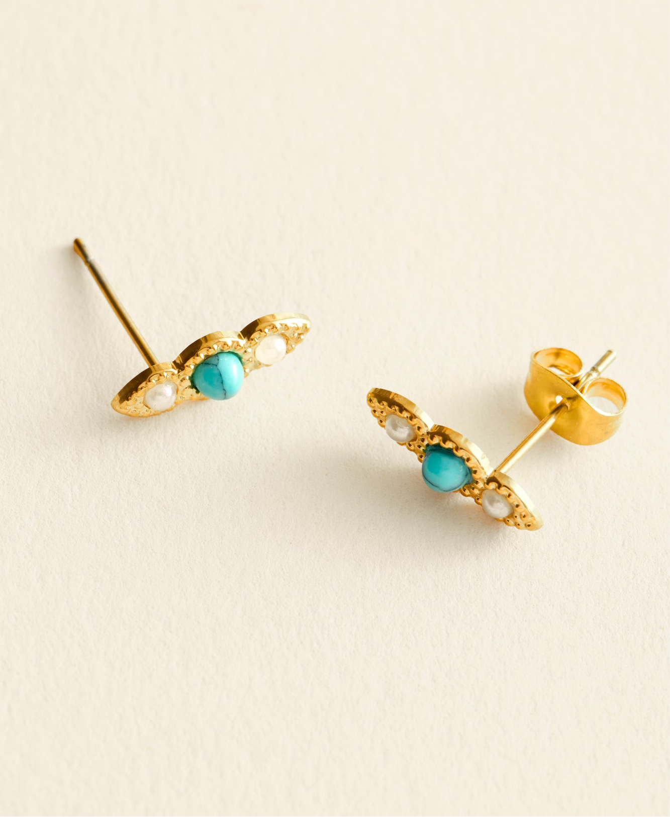 Les puces d'oreilles SYMI sont perlées de cabochons turquoises et nacrés.