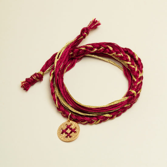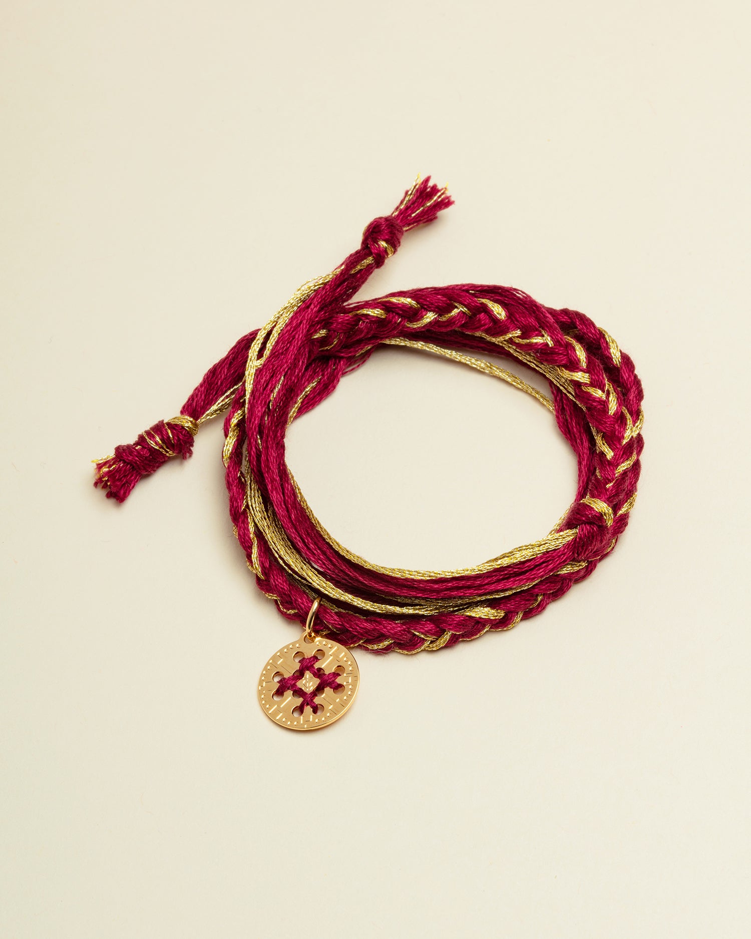 L'Amulette ronde RIMINI, notre amulette classique et chic gravée de motif incas...Coup de cœur assuré ! A nouer simplement, ce modèle peut se porter en 2 ou 3 rangs autour du poignet ou en collier simple.